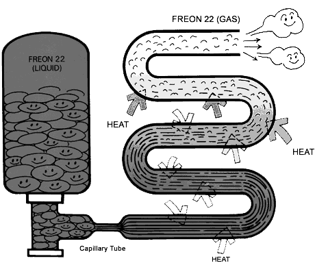 The figure below shows the flow of Freon 22 which evaporates and flows inside a tube while absorbing heat from the surrounding air. In other words it shows how heat is transferred from one location to another location.