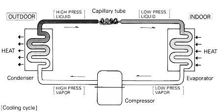 The refrigerant Freon 22 repeats absorption and radiation of heat (evaporation/condensation) in a cycle shown below.