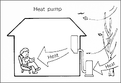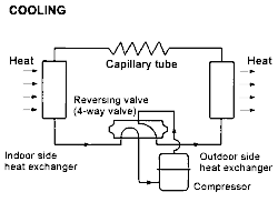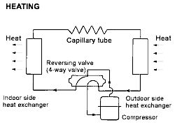 Heat pump is a system which evaporates refrigerant outdoor and transfers heat absorbed inside a room for heating that works in reverse to the preceeding cooling. In other words radiates heat inside a room by condensation and absorbs heat by evaporation at outdoor.